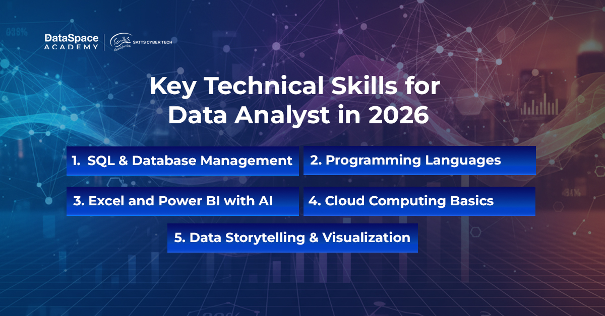 The rapid adoption of AI has significantly transformed the core skill sets for data analysts in 2026- now broader and deeper than ever. Today, the role of data analysts spans from proficiency with technical toolkit to soft skills like storytelling and understanding of businesses.